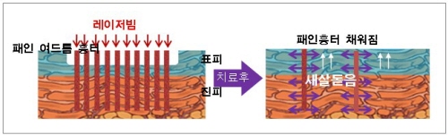 즉 여드름흉터에 군데군데 레이저 빔을 조사해 피부조직을 자극해 정상피부에서 새살을 돋아나게 해서 흉터가 채워지며 치료되는 원리다.