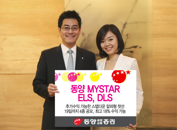 동양종합금융증권은 오는 19일까지 원금보장형 및 조기상환형 파생결합증권인 ‘동양 MYSTAR ELS’ 3종(383~385호), ‘동양 MYSTAR DLS’ 1종(17호)을 총 390억원 규모로 공모한다고 밝혔다.