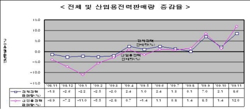 지식경제부 전기위원회는 지난달 산업용 전력판매량이 지난해 같은 기간과 비교해 12.0% 증가해 지난 2002년 1월(13.5%) 이래 월간 기준으로 최대 증가율을 기록했다고 14일 밝혔다.