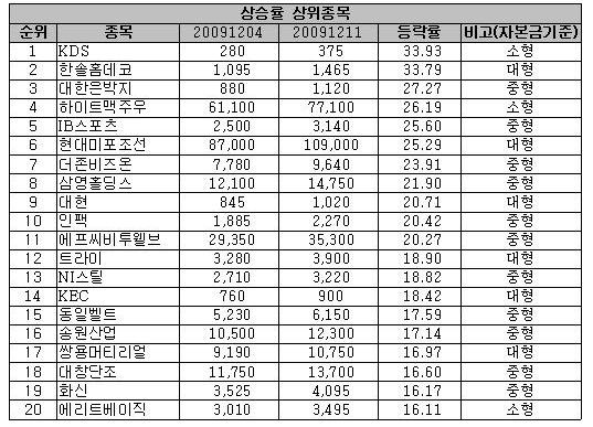 상위 종목 중 대현과 송원산업은 증권사의 호평으로 주목받으면서 지난 한 주동안 각각 20.71%, 17.14% 올랐다.