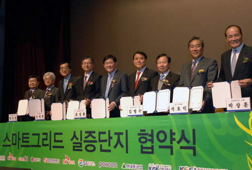 최경환 지식경제부 장관은 16일 서울 삼성동 한국전력공사 대강당에서 김쌍수 한전 사장, 오세현 SK텔레콤 사장과 스마트그리드사업단장, 스마트그리드협회장, 한국에너지기술평가원장, 전기공사협회장, GS칼텍스 등 스마트그리드 콘소시엄 대표와 관련기업 대표 등 100여명이 참석한 가운데 '스마트그리드 실증단지 관련회의'를 갖은 후 스마트그리드 실증단지 10개 공모 컨소시엄 대표들과 '스마트그리드 실증단지' 사업협약 체결식을 가졌다.