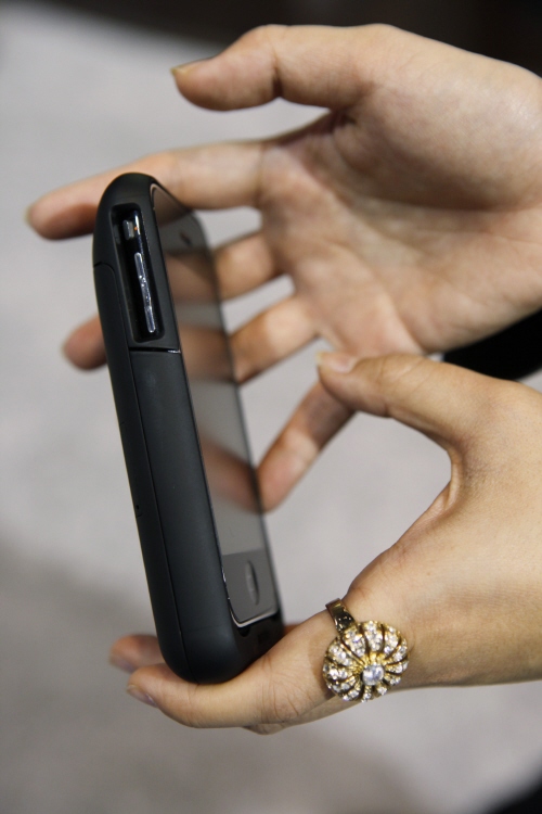 9일(현지시간) 미 네바다주 라스베거스의 CES2010 전시장에서 휴대폰 액세서리 전문업체인 모피(Mophie)의 아이폰용 외장밧데리가 선보여지고 있다. <뉴시스>