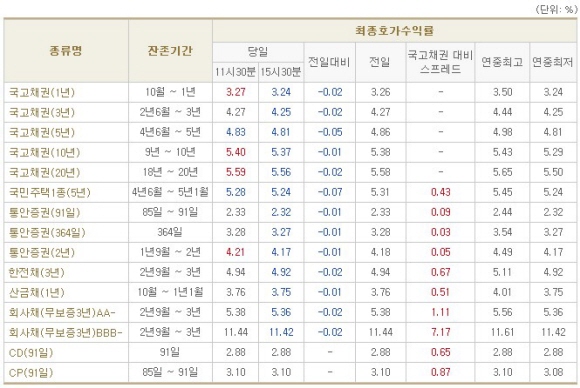 통안증권 1년물은 1bp 하락한 3.27%, 2년물은 1bp 하락한 4.17%로 마감했다. 91일물 CD금리는 전일과 같은 2.88%, 91일물 CP금리는 전일과 동일한 3.10%로 고시됐다.