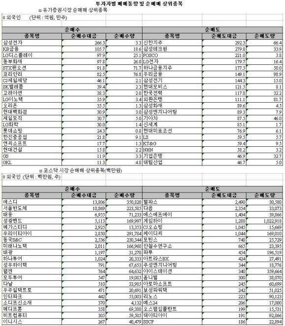 코스닥시장에서는 제조를 중심으로 IT하드웨어, 금속, 제약, 반도체 등을 사들였고 인터넷을 중심으로 IT소프트웨어, 기계 장비, 통신방송서비스, 방송서비스 등을 팔아치웠다.