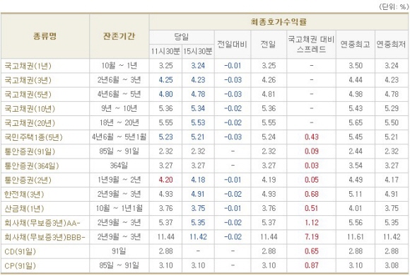 통안증권 1년물은 전일과 같은 3.27%, 2년물은 1bp 하락한 4.18%로 마감했다. 91일물 CD금리는 전일과 같은 2.88%, 91일물 CP금리는 전일과 동일한 3.10%로 고시됐다.