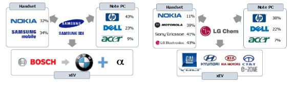 LG화학은 전기차 등 대형전지 부문에서 경쟁력을 확보하고 있고 삼성SDI는 넷북 등 소형전지에서 강점을 갖고 있다. 또 삼성SDI는 기술적 안전성과 제품의 신뢰도에서 우위를, LG화학은 핵심소재 자체 생산을 통한 코스트 경쟁력에서 강점을 보유한 게 일반적인 평가다.