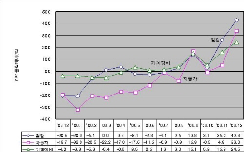 업종멸 전력사용량을 보면 철강이 42.8%로 가장 높은 증가율을 기록했으며 자동차 33.8%, 기계장비 24.5%, 조립금속 22.7%, 화학제품 16.8%, 반도체 11.9%, 섬유 11.7%, 석유정제 8.6%, 조선 5.9% 등의 순으로 나타났다.