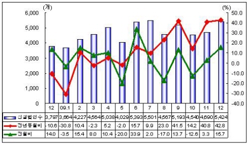 또한 작년 12월 신설법인동향을 살펴보면 신설법인은 5424개로 전월비로는 15.7%(734개) 증가했으며, 전년동월비로는 42.8%(1,627개) 증가해 6월부터 7개월 연속 호조세 기록한 것으로 나타났다.