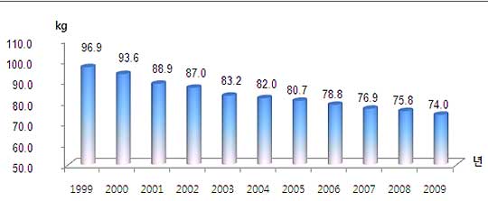 2009 양곡년도 가구부문 1인당 양곡소비량은 82.3㎏으로, 전년(83.9kg) 대비 1.6㎏(1.9%) 감소했다.