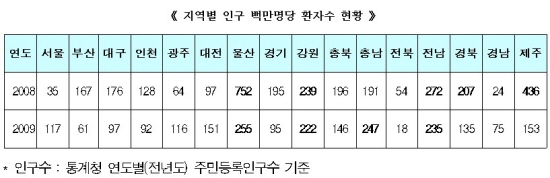 시·군·구 별 인구 만명 당 발생 환자수를 보면 전남 신안이 82명으로 가장 높았고 강원 평창 39명, 충북 괴산 18명, 경북 영양 16명, 강원 양양 15명 등 61개 기초자치단체가 1만명당 평균 환자수 1.21명을 웃돌았다.