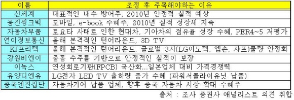 봉원길 대신증권 종목전략팀장은 "향후 시장이 안정적인 성장세를 나타낼 수 있는 IT전자, 자동차 업종의 기업들이 조정장에서 주목받을 것"이라며 "이녹스, 유양디엔유, 중국엔진집단이 유망하다"고 꼽았다.
