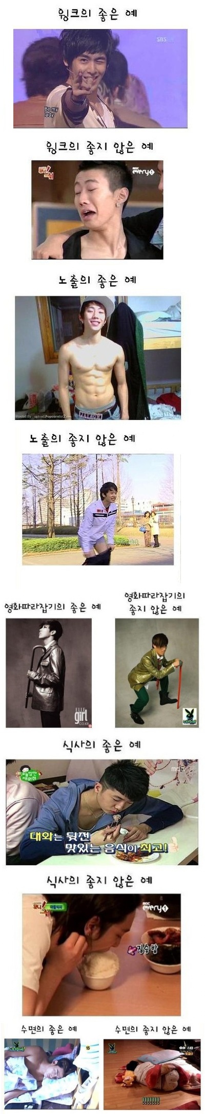 남성 아이돌그룹의 대표 주자 '짐승돌' 2PM(재범, 택연, 우영, 닉쿤, 준수, 준호, 찬성) 멤버들의 '좋은 예'와 '나쁜 예'가 인터넷을 떠돌며 네티즌들에게 큰 웃음을 주고 있다.