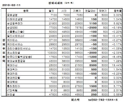 이밖에 삼성광주전자(+5.82%)와 한국증권금융(+1.07%), 휠라코리아(+5.77%), KT파워텔(+2.31%), SK건설(+0.55%), 메디슨(+1.31%)등 장외종목들은 상승 마감했다.