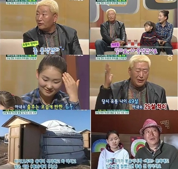 2일 오전 MBC '기분좋은 날'에 출연한 유퉁은 29살 어린 몽골인 자르갈(24)씨와 딸 다예(6)양과 함께 출연했다.