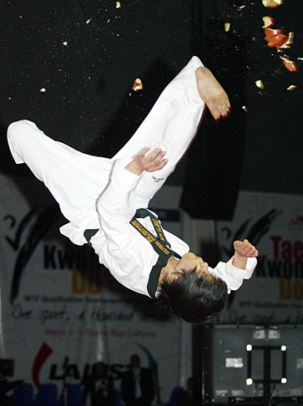 세계태권도연맹(총재 조정원,WTF)의 한 시범단 단원이 6일 (현지시간) 멕시코 티후아나 종합체육관에서 열린 제8회 세계청소년태권도선수권대회 개막식에 참가해 격파시범을 보이고 있다. 그는 공중에서 뒤로 한 바퀴 돌며 칼 끝에 꽂힌 사과를 격파했다.