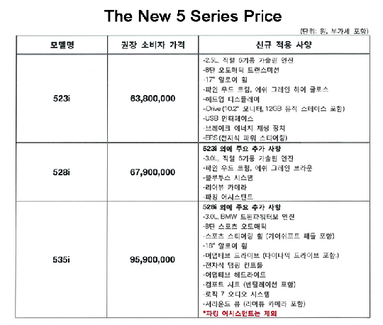 모두 세 가지 라인업에 직렬 6기통 2.5ℓ엔진을 얹은 523i이 6380만 원, 직렬 6기통 3.0ℓ엔진을 얹은 528i가 6790만 원이다. V6 3.0ℓ엔진에 트윈 터보를 얹고 뉴 5시리즈의 꼭짓점에 올라선 535i는 9590만 원이다.