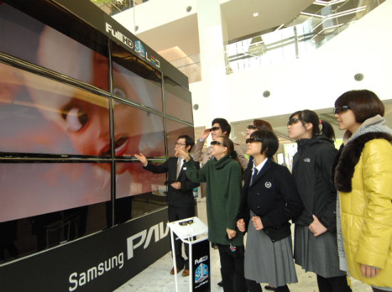 ▲삼성파브가 풀HD 3D LED TV 체험 마케팅을 강화한다. 3월 14일까지 서울 신세계 영등포점 타임스퀘어 1층에서 펼쳐지는 삼성파브 프리미엄 3D 체험존을 찾은 고객들이 55인치 삼성파브 풀HD 3D LED TV 9대로 구성된 거대한 TV 조형물을 통해 3D 입체화질을 직접 체험하고 있다.