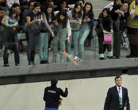 '피겨 여왕' 김연아는 2010 ISU 세계 피겨스케이팅 선수권대회에서 은메달을 차지했다. 그녀는 27일 오후(한국시간) 이탈리아 토리노에 위치한 팔라벨라 빙상장에서 열린 여자 프리 프로그램에서 멋진 연기를 선보인 뒤 현지 관중들로부터 꽃다발을 전달받고 있다.