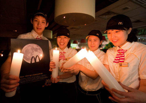 한국맥도날드에 따르면 지난 27일 저녁 8시 30분부터 기후 변화에 대한 경각심을 알리는 세계야생동물기금협회 (WWF)의 환경캠페인인 ‘지구촌 불끄기 2010(Earth Hour 2010)’ 행사에 동참해 전국 237개 매장에서 5분간 기본조명을 제외한 매장 내ㆍ외부의 전등을 모두 소등했다.