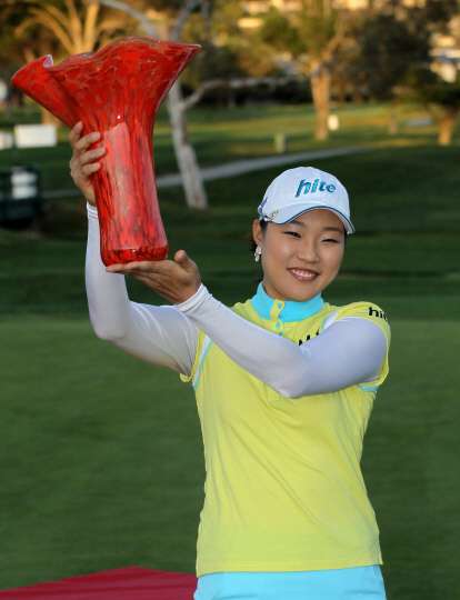 미국여자프로골프(LPGA) 투어 KIA클래식이 29일(한국시간) 미국 캘리포니아주 칼스배드의 라코스타 골프장에서 열렸다. 이 대회에서 한국의 대표골퍼 서희경(하이트·24)이 올 시즌 첫 우승 트로피를 들어 올리며 기뻐하고 있다. 그녀는 12언더파 276타로 정상을 차지했고 뒤를 이어 박인비가 6언더파 282타로 2위를 기록했다. 신지애와 이지영은 각각 5언더파 283타로 공동 3위에 올랐다.
