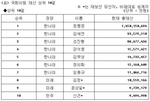 [공직자재산공개-표]국회의원 상위10위