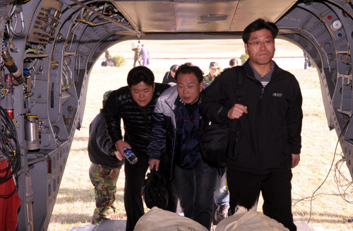 천안함 침몰 실종자 가족 10명이 구조작업을 지켜보기 위해 2일 오전 경기도 평택 해군2함대사령부에서 헬기를 이용해 백령도 사고현장으로 향하고 있다.