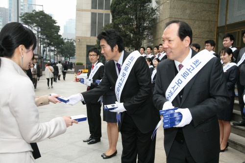 이날 이재우 신한카드 사장은 황원섭 신한카드 노조위원장과 함께 지하철 2호선 을지로 입구역에서 시민들에게 기념품을 나눠주며 '한국에서 가장 존경받는 기업'에 3년 연속으로 선정된 것에 감사의 뜻을 전하는 시간을 가졌다.