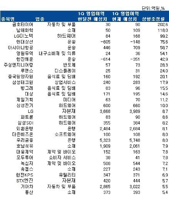 김동영 우리투자증권 연구원은 1분기 실적전망이 상향조정된 기업에 주목했다.