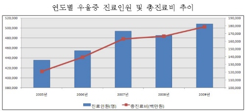 6일 건강보험심사평가원이 2005~2009년 5개년의 우울증에 대한 심사결정자료를 분석한 결과 진료인원 및 총 진료비가 각각 연평균 4.0%, 10.4% 증가한 것으로 조사됐다.