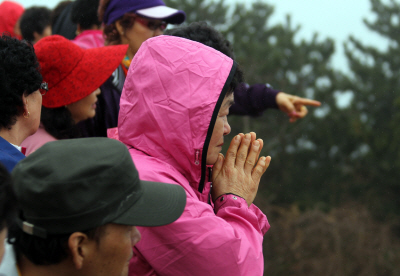 10일 오전 천안함 인양작업이 진행중인 백령도 장촌해안에서 관광을 위해 부산에서 백령도를 방문한 한 관광객이 바다안개속에 휩싸여 있는 함수침몰지역을 바라보며 두손모아 기도하고 있다.