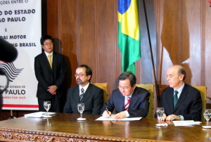 ▲오는 5월로 예정돼있던 현대차 브라질 공장 착공식이 현지사정으로 미뤄졌다. 사진은 지난 2008년 연산 10만대 규모의 완성차 공장 건설을 위한 '현대차-상파울루주'간의 양해각서(MOU) 체결 모습