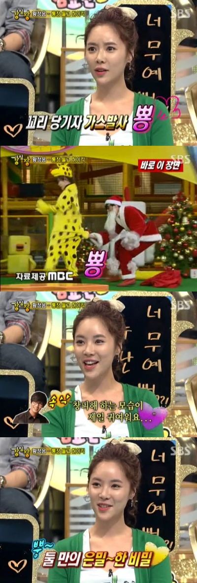 그녀는 "루돌프 의상을 입고 촬영을 했던 적이 있었는데 그날 몸이 힘들어서 가스가 많이 찼다"며 "그런데 최다니엘이 자꾸 NG를 내는 바람에 꾹꾹 참다가 결국 힘이 풀려 방귀가 나와버렸다"고 말해 주변을 폭소케 했다.