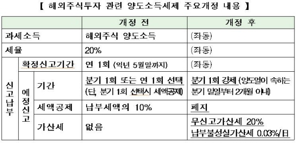 금투협 관계자는 "납세자의 해외주식 양도소득세 관련 과도한 협력의무를 최소화하기 위해 분기별 예정신고·납부제도를 폐지하거나, 업계 준비 및 교육 등에 필요한 최소 시간을 확보할 수 있어야 한다"며 "해외주식 양도소득 분기별 신고 강제화 시행시기 유예 필요하다"고 설명했다.
