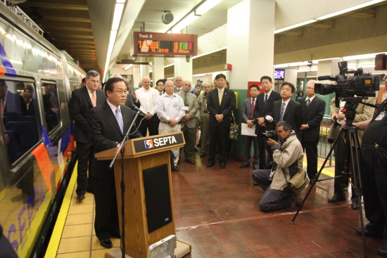 ▲SEPTA 전동차 공개행사에서 현대로템 이민호 사장이 연설을 하고 있다.