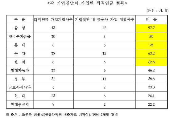 삼성의 경우 퇴직연금 가입 계열사 43곳 가운데 42곳이 그룹내 금융회사에 가입했다. 한국투자금융도 10곳중 8곳이, 롯데는 8개 계열사 중 6곳, 동양은 19곳중 12곳, 한화는 8곳중 5곳이 그룹내 금융사에 퇴직연금을 맡겼다.