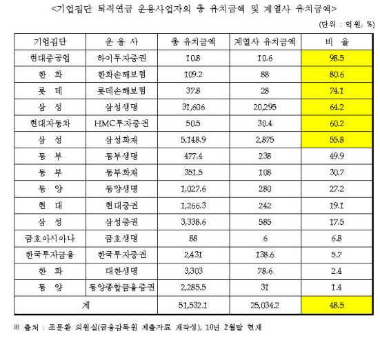 조 의원이 금융감독원으로부터 제출받아 분석한 자료에 따르면 올 2월말 현재 대기업계열 금융회사 15곳의 퇴직연금 유치금액은 5조1532억원에 달했으나 이 가운데 계열사들로부터 유치한 금액이 무려 2조5034억원으로 48.5%나 차지했다.