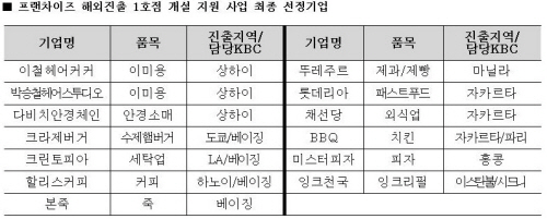 코트라는 최근 사업에 응모한 31개 프랜차이즈 기업중 13개사를 선정했다. 선정기업의 해외진출 희망지역은 중국(상하이·베이징)이 7개사로 가장 많았고 총 10개 국가 11개 도시에 진출할 예정이다.