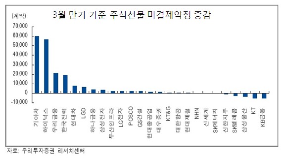 우리투자증권에 따르면 주식선물 미결제약정은 기아차와 하이닉스 선물이 각각 6만계약과 5만6000계약의 증가를 보였고 우리금융 선물도 2만계약 이상 증가했다.