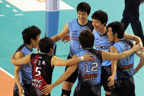 현대캐피탈 선수들이 16일 천안 유관순체육관에서 열린 남자프로배구 챔피언결정 5차전에서 삼성화재를 물리친 후 즐거워하고 있다. 챔피언결정 6차전은 이틀 뒤 삼성화재의 홈 경기장 대전충무체윤관에서 펼쳐진다. 7전 4선승제로 진행되는 챔피언결정전에서 현재까지 삼성화재가 3승2패로 앞서 있다.