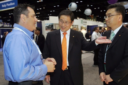 ▲한화L&C의 최웅진 대표이사가 4월 17일(한국 시각) 미국 시카고 맥코믹 플레이스에서 열린 주방 및 욕실용품 전문 전시회인 '2010 KBIS(Kitchen & Bath Industry Show)'의 한화L&C부스 앞에서 미국 바이어들에게 자사의 주력 제품인 프리미엄 인테리어 스톤 '칸스톤(현지명 한스톤)'과 '하넥스' 신제품을 소개하고 있다. 이번에 선보인 제품들은 지난해 7월 준공한 캐나다 현지 공장에서 생산된 신제품으로 다양한 색상과 패턴으로 행사에 참여한 바이어들로부터 많은 관심을 받았다. 한화L&C는 앞으로 캐나다 공장에서 현지 소비자의 니즈를 반영한 다양한 칸스톤 제품들을 생산해 적극적으로 북미시장을 공략할 계획이다.