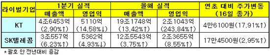 국내 통신업계의 양대산맥인 KT와 SK텔레콤이 1분기 영업이익은 저조하나 마케팅비용 규제에 따른 비용 절감 효과에 힘입어 올해 전체 실적이 전년대비 개선될 전망이다.