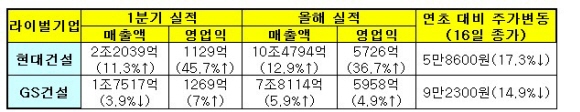 반면 GS건설은 올해 1분기 매출액은 1조7517억으로 전년동기대비 3.9% 줄어들 것으로 분석됐다. 영업이익은 1269억 7% 늘어날 것으로 분석됐다.