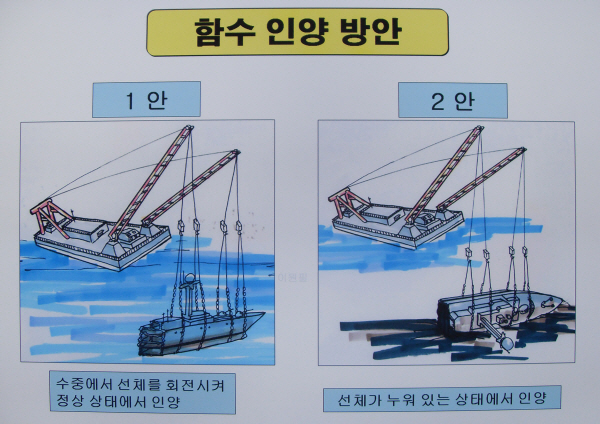 사진은 수중에서 선체를 회전시켜 정상 상태로 인양하는 방안과 선체가 누워 있는 상태에서 인양하는 방안 그림이다.