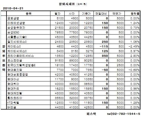 이밖에 코리아로터리서비스(+2.80%)와 한국증권금융(+0.85%), KT파워텔(+1.28%), 솔로몬투자증권(+1.0%), 스포츠토토(+0.39%)등 장외종목들은 상승 마감했다.