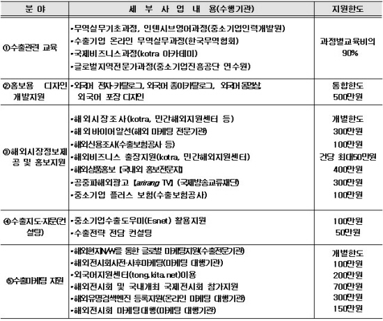 이번 사업에 선정된 기업은 ▲무역 실무교육 ▲제품 카달로그 및 동영상등 홍보용 디자인개발 ▲경쟁사 제품사양 및 소비자 구매패턴 등의 시장정보제공 ▲바이어 연계 ▲해외홍보지 광고 ▲수출서식 및 바이어 상담관련 통ㆍ번역 ▲수출 애로 컨설팅 등 총 1500만원 내외로 해외시장 개척 초기에 필요한 전방위적인 지원을 받게된다.
