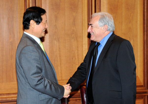 G20재무장관회의 참석차 미국 워싱턴을 방문중인 윤증현 기획재정부 장관이 21일 오후(현지시간) 도미니크 스트로스 칸 IMF총재와 악수를 하고 있다.