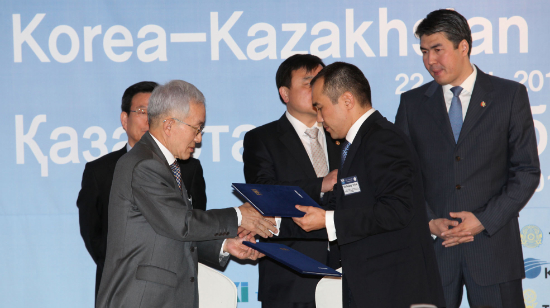 ▲누르술탄 나자르바예프 카자흐스탄 대통령의 국빈 방문에 맞춰 전경련은 카자흐스탄 상공회의소(CCI RK)와 양국간 투자 및 교역 확대 방안을 논의를 위해 22일 롯데호텔에서 ‘한·카자흐스탄 비즈니스포럼’을 개최했다. 정병철 전경련 부회장과 코자스바이 카자흐스탄 상공회의소(CCI RK) 회장간 양해각서를 체결하고 있다.