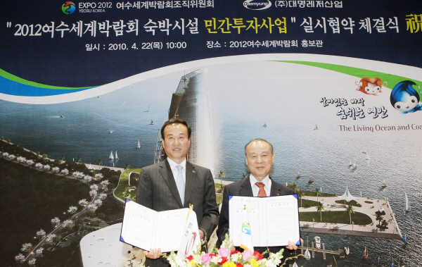 강동석 2012여수세계박람회 조직위원장(왼쪽)과 박흥석 (주)대명레저산업 총괄사장이 22일 오전 여수시 박람회 홍보관에서 숙박시설 민간투자사업 실시협약을 체결했다.