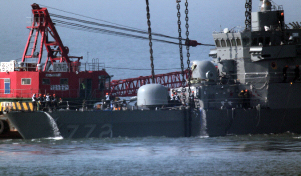 침몰한 천안함 함수인양이 본격적으로 시작된 24일 오전 백령도 인양작업 해역에서 관계자들이 천안함을 수면위로 올리며 함수에 찬 물을 퍼내고 있다.