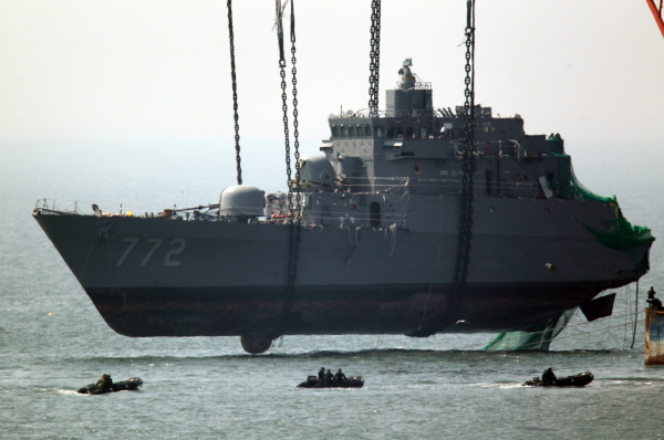 침몰한 천안함 함수가 24일 오전 물 위로 들어 올려지고 있다.